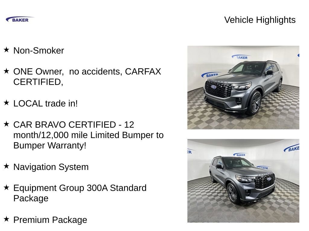 New Price! Gray Metallic 2026 Ford Explorer ST-Line 4WD 10-Speed Automatic 2.3L EcoBoost I-4 Non-Smoker, ONE Owner, no accidents, CARFAX CERTIFIED,, LOCAL trade in!, CAR BRAVO CERTIFIED - 12 month/12,000 mile Limited Bumper to Bumper Warranty!, Explorer ST-Line, 4WD, Gray Metallic, Onyx Cloth, 110V/150W AC Power Outlet, 2nd Row Captain's Chairs w/E-Z Entry and Armrest, 2nd Row Heated Seats, 3rd row seats: bench, Ambient Lighting, Auto-Dimming Interior Rear-View Mirror, Automatic temperature control, Equipment Group 300A Standard Package, Exterior Parking Camera Rear, Front dual zone A/C, Heated front seats, Heated steering wheel, Heated Unique Cloth Captain's Chairs, Manual-Folding Sideview Mirrors, Memory Driver's Seat, Navigation System, Panoramic Fixed Glass Roof with Power Shade, Performance Brakes, Power driver seat, Power Liftgate, Power passenger seat, Premium Package, Radio: B&O Sound System by Bang and Olufsen, Rain-Sensing Wipers (front Only), Red Painted Performance Front and Rear Brake Calipers, ST-Line Street Pack, Wheels: 21 Magnetite-Painted Aluminum.