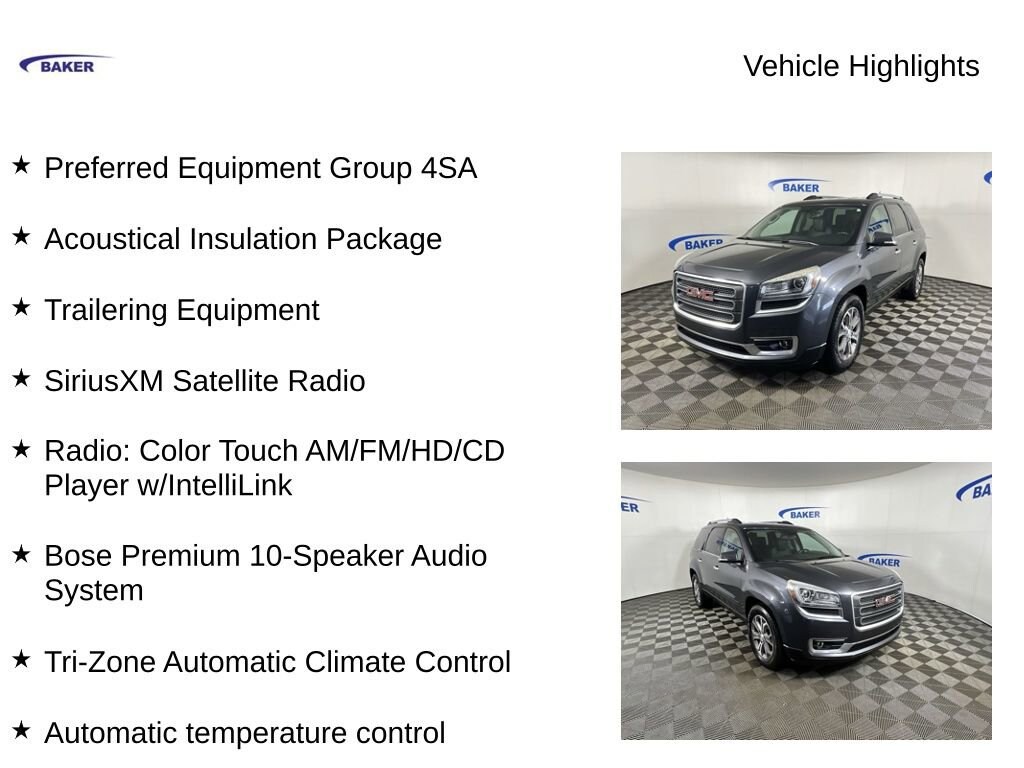 New Price! Cyber Gray Metallic 2013 GMC Acadia SLT-1 AWD 6-Speed Automatic 3.6L V6 SIDI Acadia SLT-1, 3.6L V6 SIDI, AWD, Ebony Leather, 19 x 7.5 Aluminum (4) Wheels, 2-Way Power Front Passenger Seat, 7-Passenger Seating (2-2-3 Seating Configuration), 8-Way Power Driver Seat, Acoustical Insulation Package, Automatic temperature control, Body-Color Bodyside Moldings, Body-Color Heated Power-Adjustable Outside Mirrors, Bose Premium 10-Speaker Audio System, Brake assist, Dual Downturn Tailpipe Exhaust, Exterior Parking Camera Rear, Heated front seats, Heavy-Duty Cooling System, Inside Rear-View Auto-Dimming Mirror, Integral Spotter Blind-Zone Mirrors, Leather-Wrapped Steering Wheel, Power driver seat, Power Liftgate, Power passenger seat, Preferred Equipment Group 4SA, Radio: Color Touch AM/FM/HD/CD Player w/IntelliLink, Remote Vehicle Start, SiriusXM Satellite Radio, Tilt & Telescopic Steering Column, Trailer Hitch, Trailering Equipment, Tri-Zone Automatic Climate Control, Universal Home Remote, Variable Effort Power Steering.