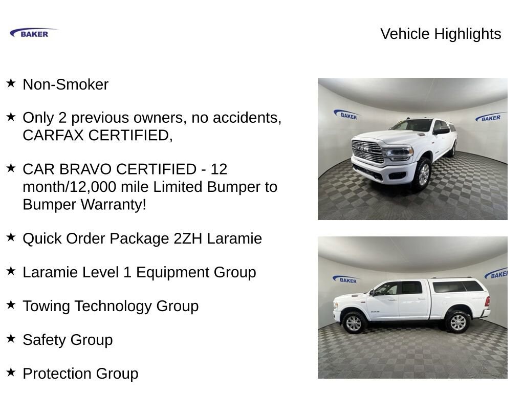 New Price! Bright White Clearcoat 2020 Ram 2500 Laramie 4WD 8-Speed Automatic 6.4L Heavy Duty V8 HEMI w/MDS Non-Smoker, Only 2 previous owners, no accidents, CARFAX CERTIFIED,, CAR BRAVO CERTIFIED - 12 month/12,000 mile Limited Bumper to Bumper Warranty!, 4D Crew Cab, 6.4L Heavy Duty V8 HEMI w/MDS, 4WD, Bright White Clearcoat, Black Leather, 2nd Row In Floor Storage Bins, Adaptive Cruise Control w/Stop, Adaptive Steering System, Auto High Beam Headlamp Control, Black Interior Accents, Blind Spot & Cross Path Detection, Body Color Door Handles, Body Color Grille Surround, CTR Stop Lamp w/Cargo View Camera, Foam Bottle Insert (Door Trim Panel), Full Speed Forward Collision Warning Plus, Lane Keep Assist, Laramie Level 1 Equipment Group, Painted Front Bumper, Painted Rear Bumper, Power Adjustable Pedals w/Memory, Protection Group, Quick Order Package 2ZH Laramie, Radio/Driver Seat/Mirrors/Pedals Memory, Rain Sensitive Windshield Wipers, Remote Tailgate Release, Safety Group, Sport Appearance Package, Sport Decal, Surround View Camera System, Tow Hooks, Towing Technology Group, Trailer Reverse Guidance, Ventilated Front Seats.